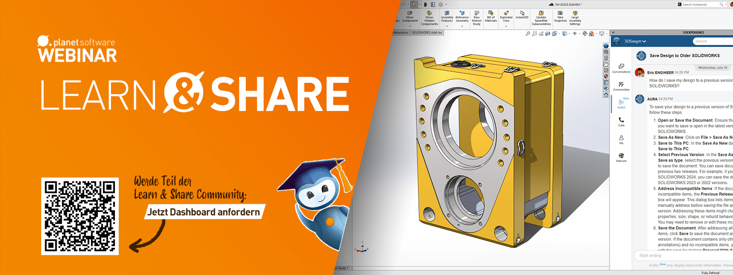 Freuen Sie sich auch 2026 auf neue Folgen unserer beliebten Webinar-Serie Learn & Share! Wir teilen nicht nur unser Wissen mit Ihnen, sondern auch praktische Konstruktionsanleitungen und ganze 3D-Modelle. Jeden Monat präsentieren Ihnen unsere Experten Dominik Kirschner und Shpend Murati ein neues Feature in SOLIDWORKS 2026 und den aktuellen Servicepacks. Das dürfen Sie auf keinen Fall verpassen!